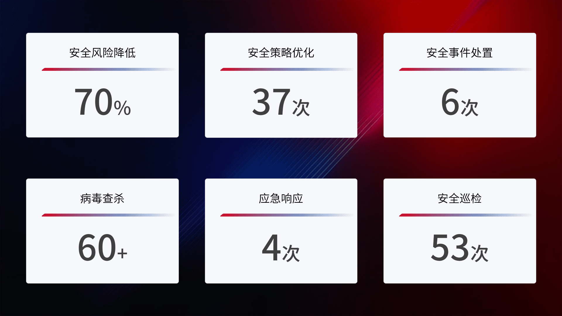 提供全面的安全事件报告体系,,,,包括处置报告、、周报、、、季度和年度总结,,结合持续监控,,帮助客户深入了解网络安全状况。。