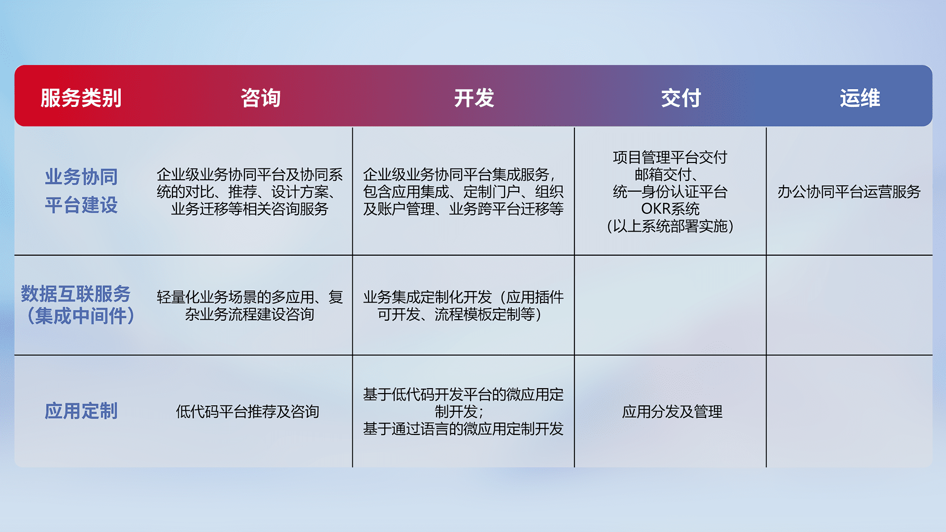 针对钉钉、、、企微、、IDaas等平台级产品提供产品的规划、、方案、、交付、、定制化开发等服务,,,,实现如统一协同办公、、、智能客户服务、、、、混合会议管理、、、、智能数据查询、、、、等业务场景,,,实现数字化转型。。。